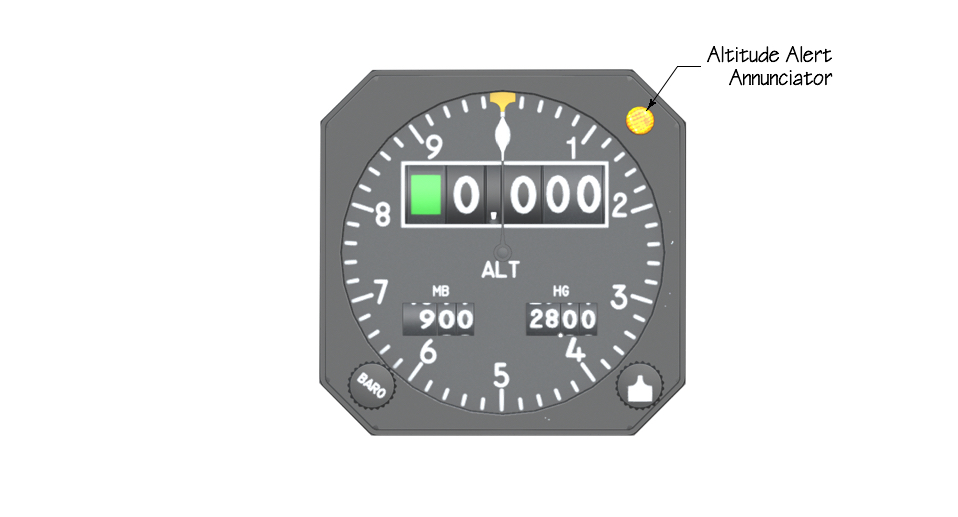 As the aircraft gets to within 1000' of the target altitude, the altitude annunciator on the Altimeter will illuminate. The lamp remains illuminated until the aircraft gets to within 250' of the target altitude, at which time the annunciator extinguishes and the alerting system arms to monitor the preselected target altitude. When the system is armed after target altitude capture, the annunciator will illuminate whenever the aircraft altitude deviates by more than 250' from the target altitude. It will also extinguish if the deviation becomes greater than 1000'. Turning the Altitude Preselect Wheel will reset the altitude alerting system.