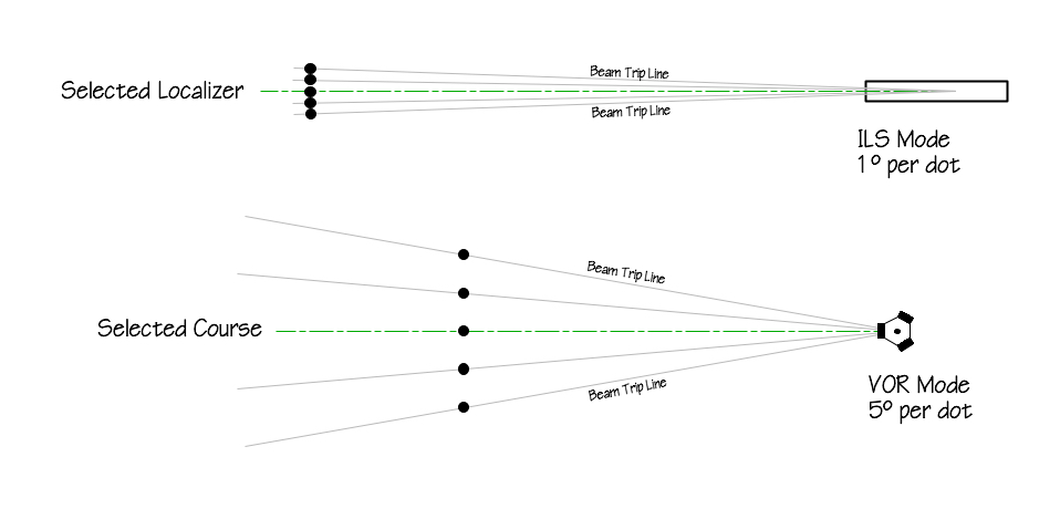 COURSE DEVIATION DOTS: Indicates the deviation, in degrees, from centerline of the selected magnetic course. In VOR mode, each dots represents approx 5º deviation from the selected course. In ILS mode, each dot represents approx 1º deviation from the selected localizer course.